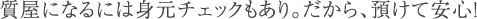 経営者は自身も人物審査を受けているため、従業員を雇う際には能力、技能、マナー等はもちろんのこと、「身元がしっかりしている」ことを最重視する傾向にあります。それもあって、質屋の番頭や従業員は自身の家族・親戚や他の質屋の家族・親戚であるケースが多くなっているのです。このように、ハードもソフトも信頼性が高いため、「預けたモノを横どりされた!」といったような事故はほとんど発生していません。手前味噌ながら、質屋は預けて安心と言えるでしょう。